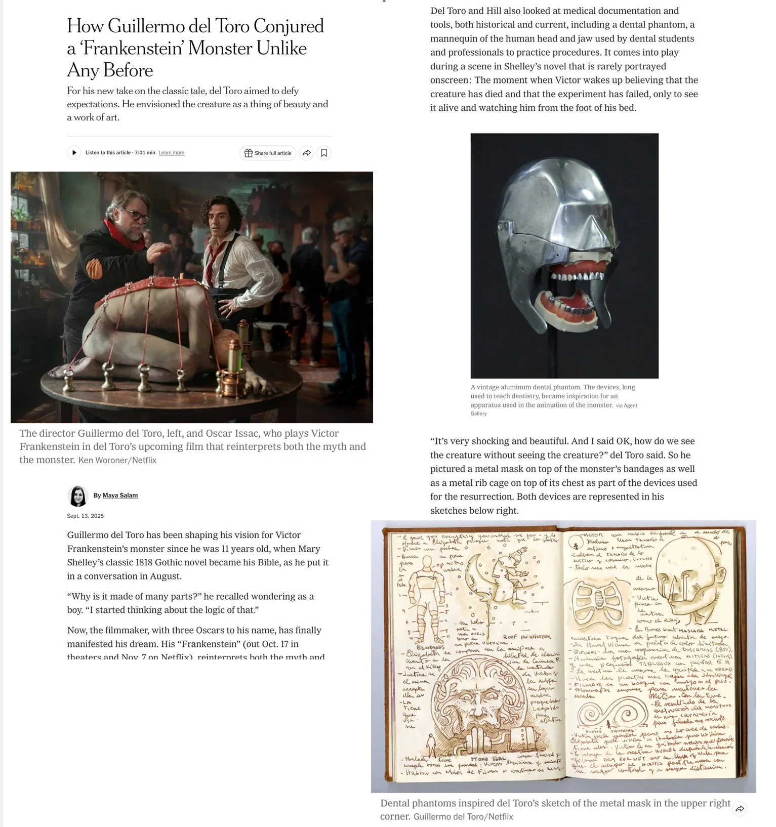 Agent Gallery’s dental phantom in todays New York Times Fall Arts preview discussing the inspiration and process of designing Frankenstein. The dental phantom became an inspirational object that he referenced while sketching how he should look—a very insightful look into the process of art and object. Published in NYT Sunday issue 9/14/25